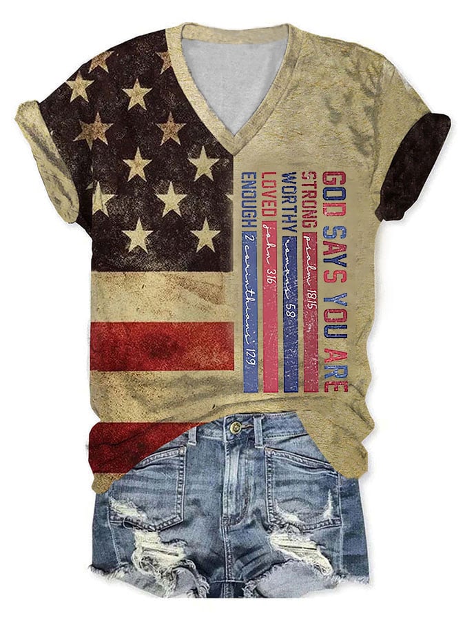 Women's Independence Day USA Flag God says you are Strong Printed V-neck T-shirt