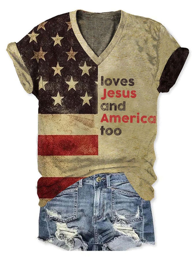 Women's Independence Day Love Jesus And America Too Print T-Shirt