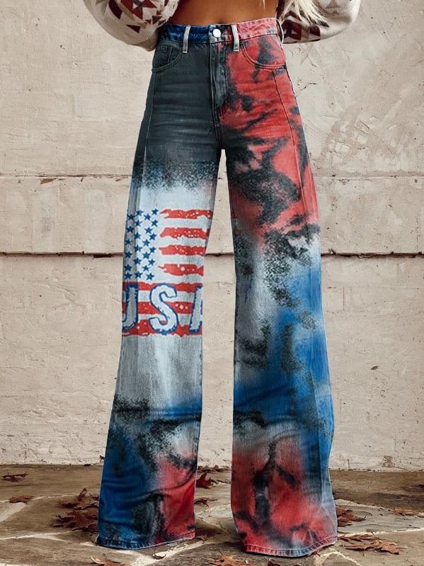 Women's Vintage Independence Day Flag Print Wide Leg Pants