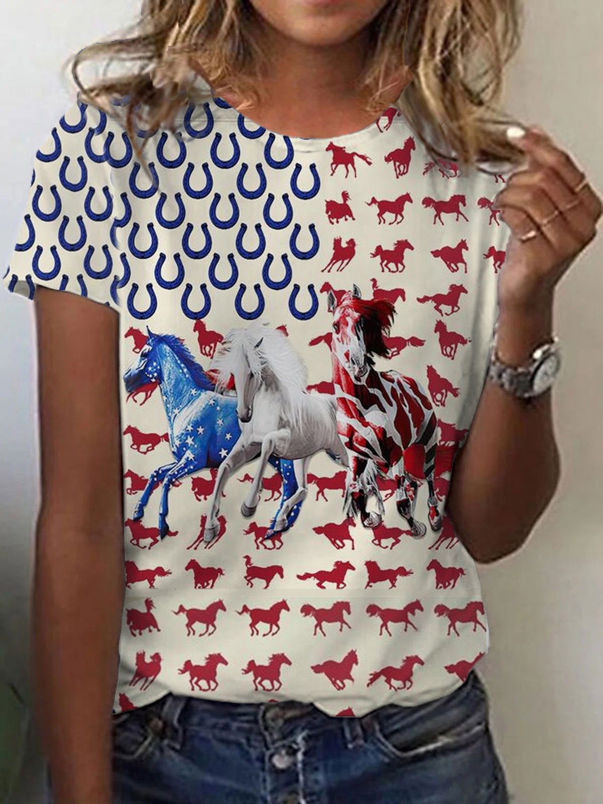 Women's Independence Day Red Blue USA Flag Horses Print Casual Tee