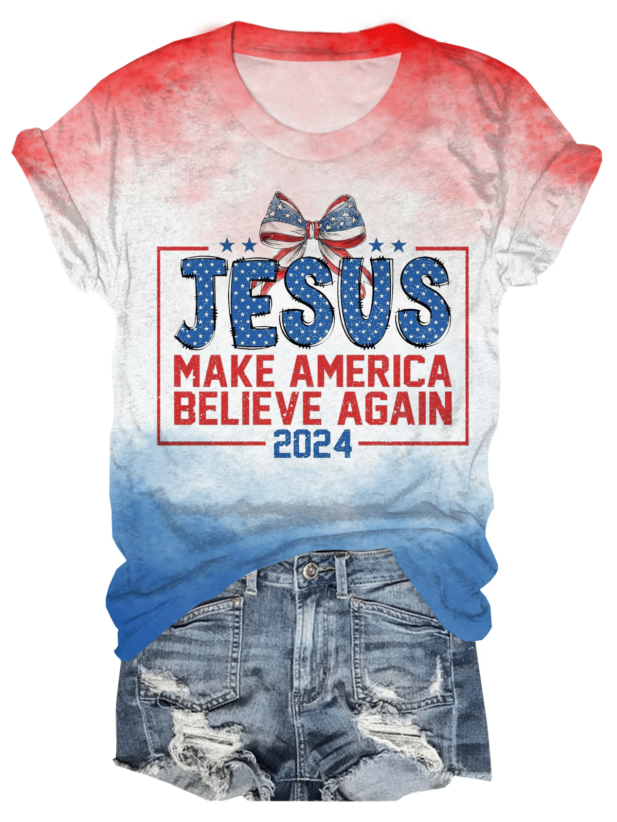 Women's Independence Day Jesus 2024 Make America Believe Again Print Casual Tee