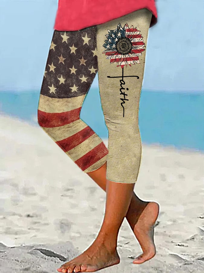 Women's Independence Day America Flag Sunflower Faith Cropped Leggings