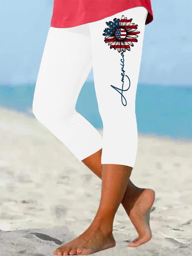 Women's American Flag Sunflower Print Independence Day Cropped Leggings