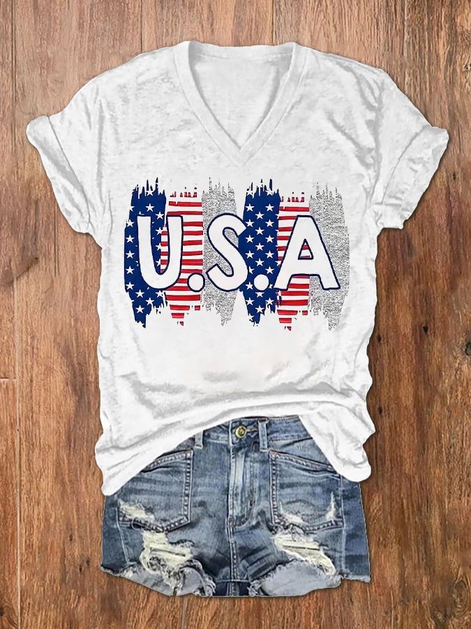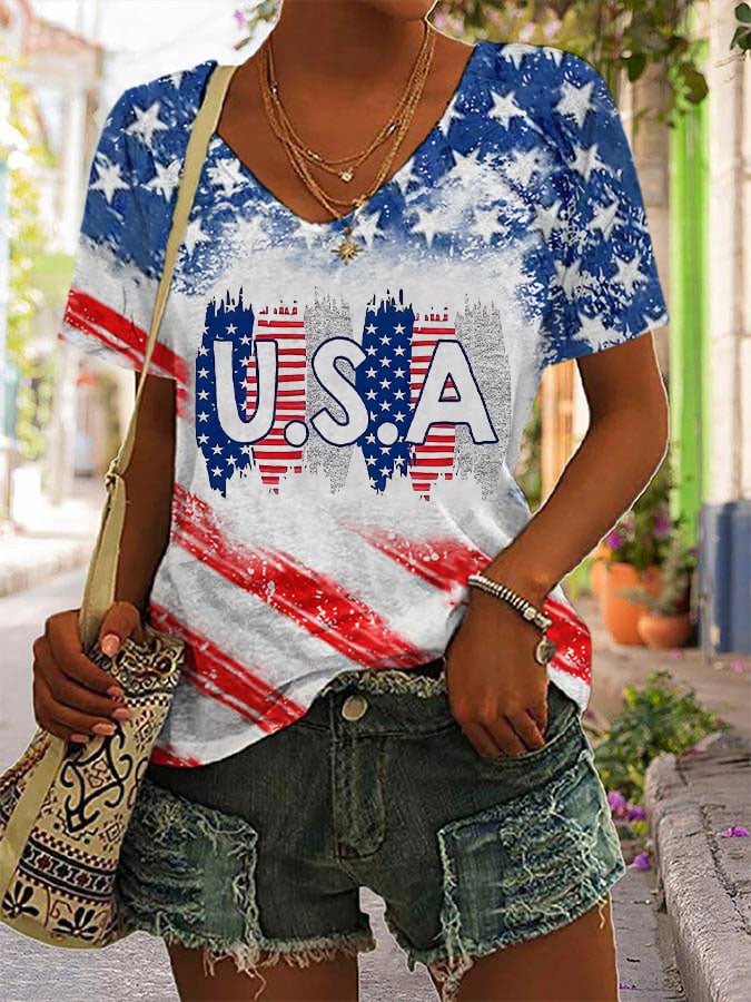 Women's USA Independence Day Printed V-Neck T-Shirt
