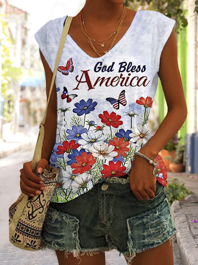 Women's God Bless America Independence Day Red White Blue Flowers Print Casual Sleeveless Tee