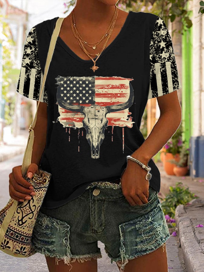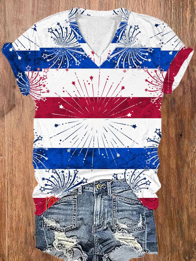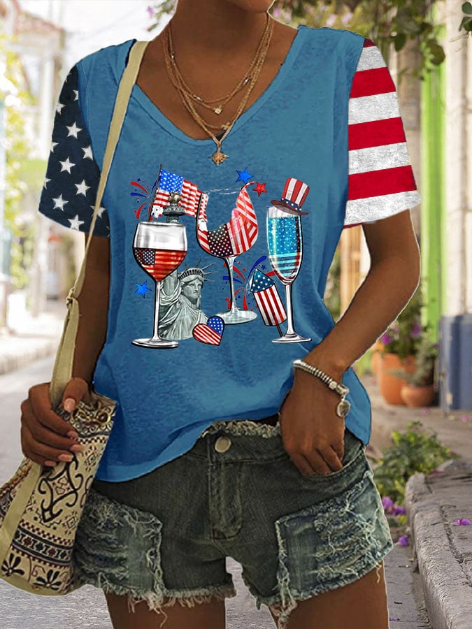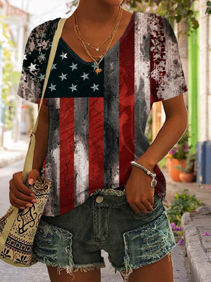 Women's Independence Day Flag Print V-Neck T-Shirt