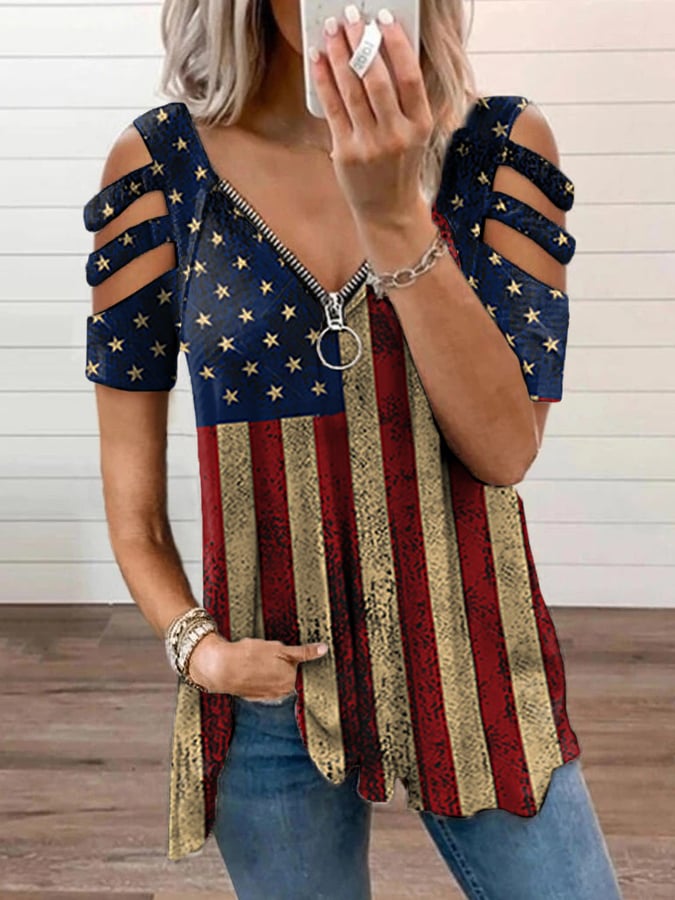 Women's Independence Day America Flag Print Casual Zipper V-Neck Tee