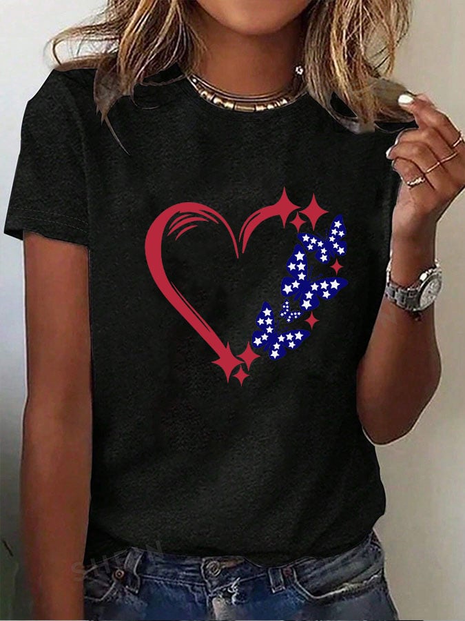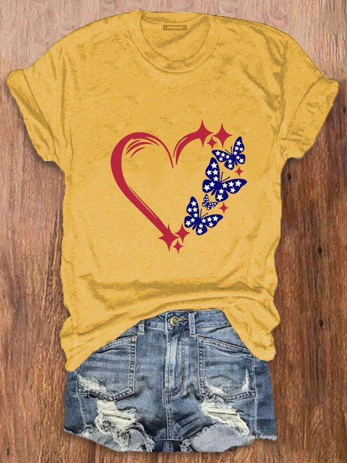 Women's Independence Day Heart Butterfly Print T-Shirt