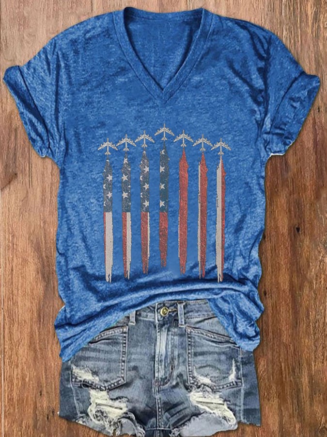 Women's Independence Day Airplane Print V-Neck T-Shirt