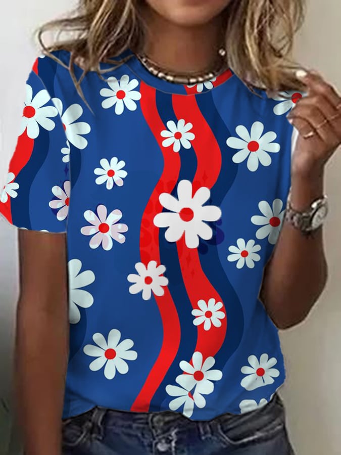 Women's God Bless America Independence Day Red White Blue Flowers Print Casual Tee