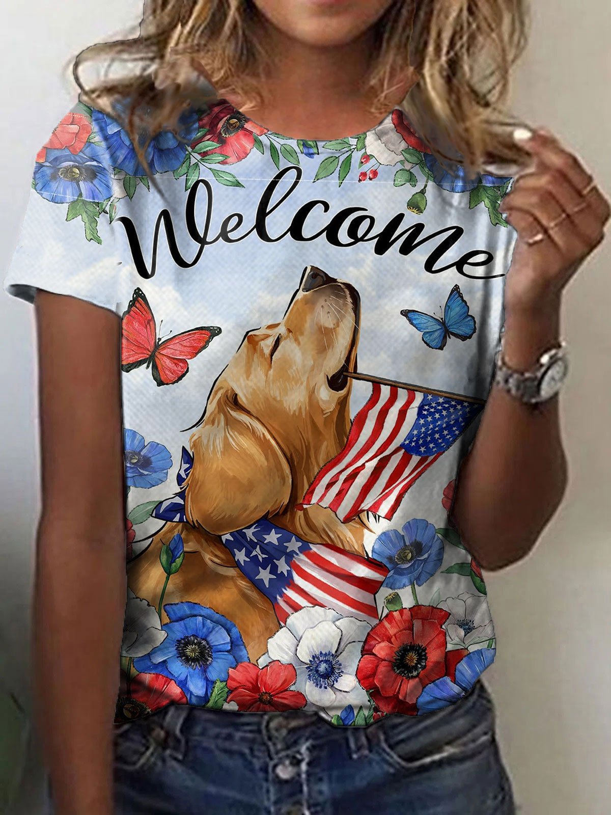 Women's Independence Day Flag Dog Print Crew Neck T-Shirt
