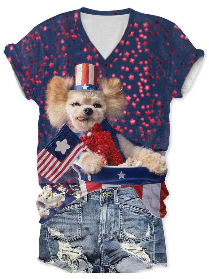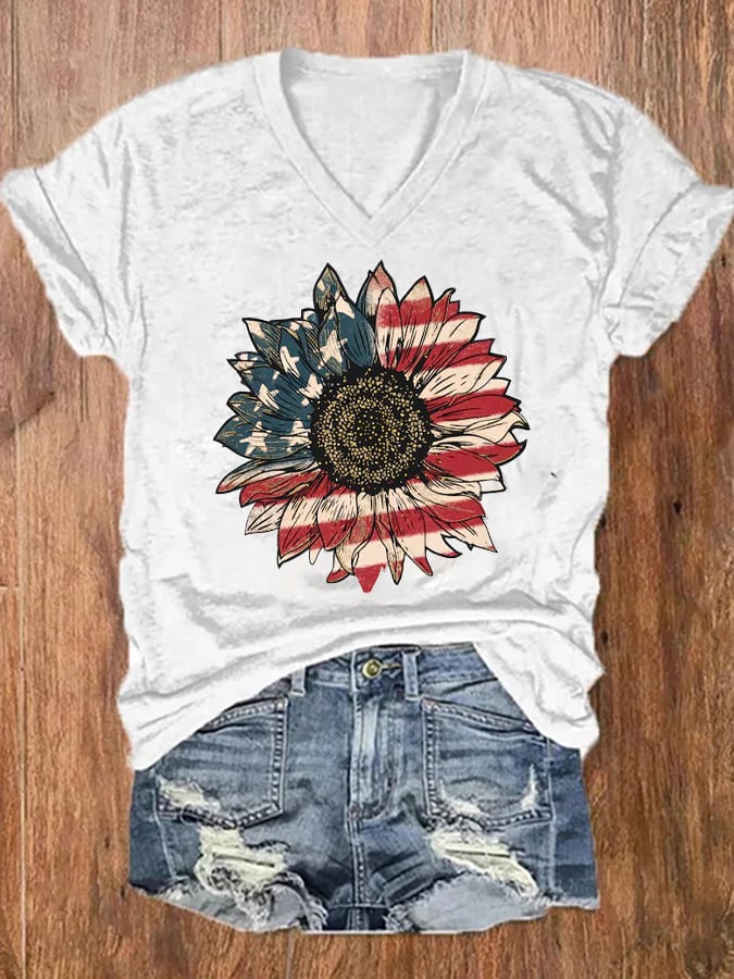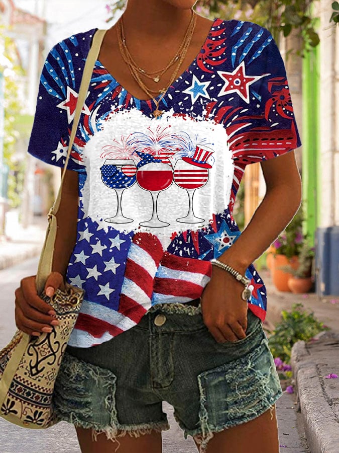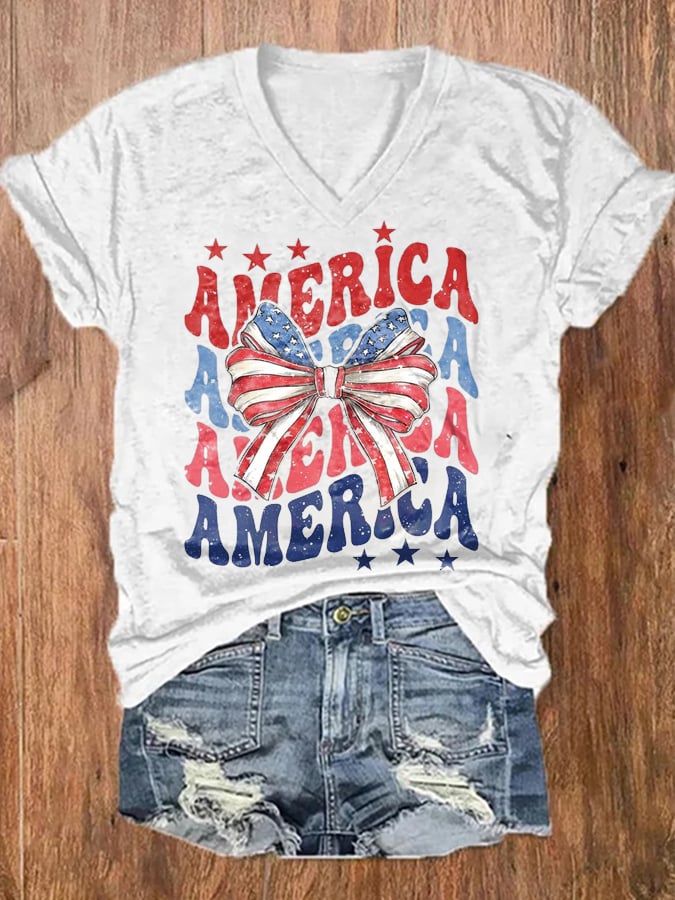 Women's American Flag Independence Day Print V-Neck T-Shirt