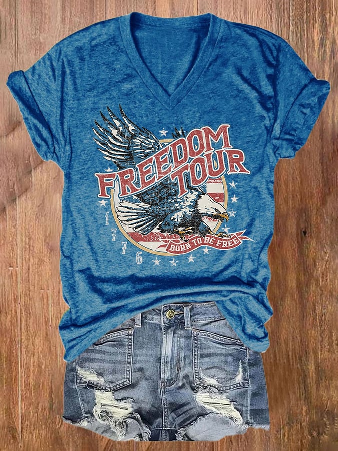 V-neck Retro Freedom Tour 1776 Eagle Born To Be Free Print T-Shirt