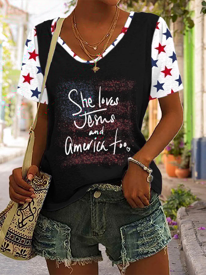Women's She Loves Jesus And American Too Print V Neck T-shirt