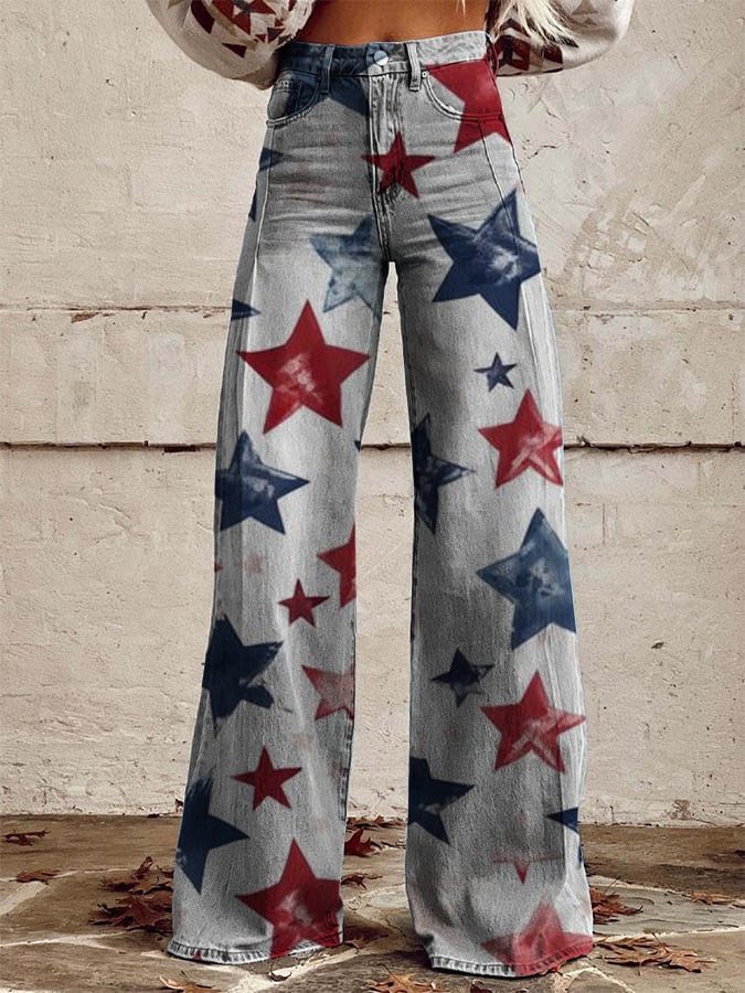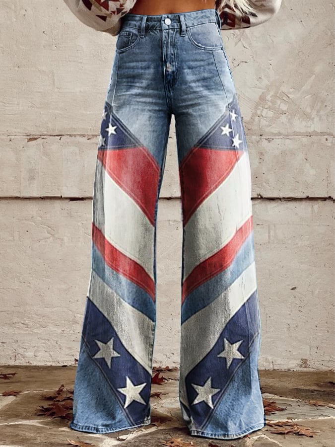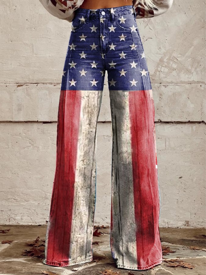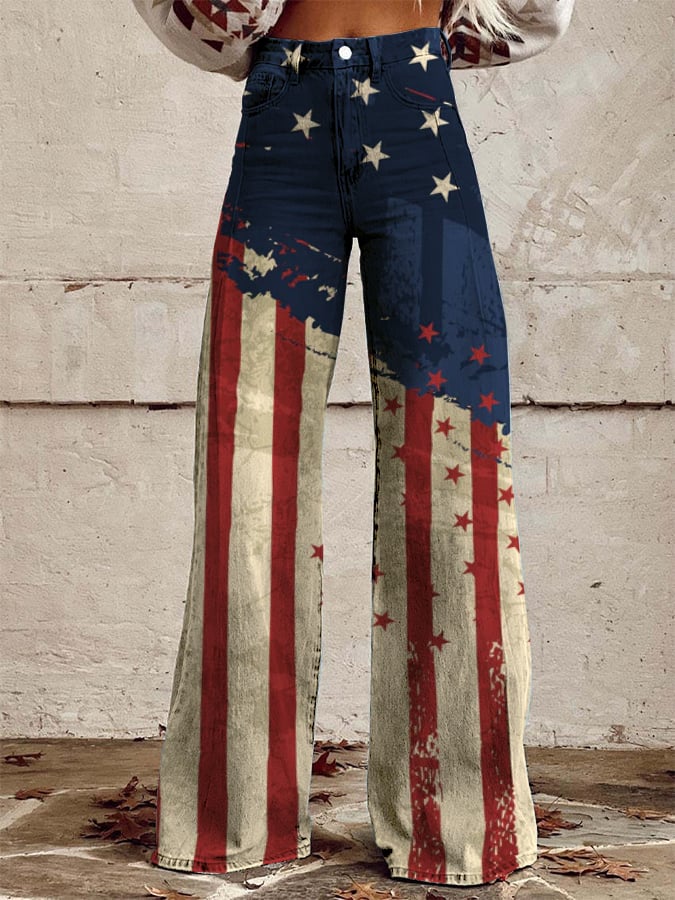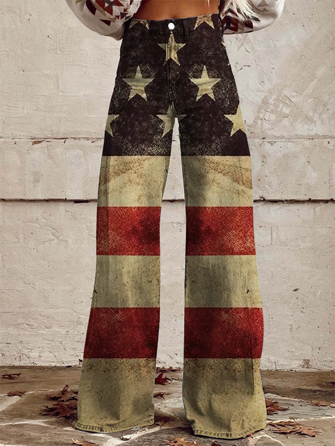 Women's Vintage Independence Day Flag Print Wide Leg Pants