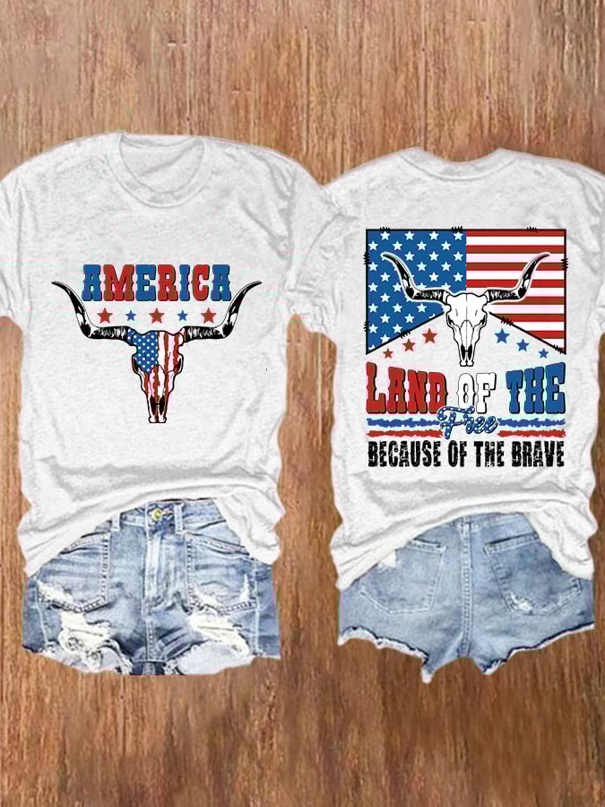 Retro Independence Day Land Of The Free Because Of The Brave Bull Skull Print T-Shirt