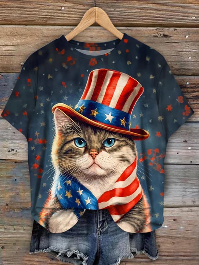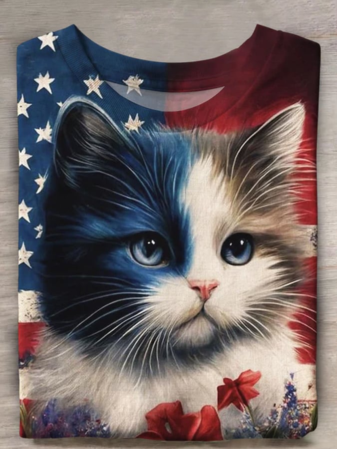 Vintage American Flag Cat Print Casual Top