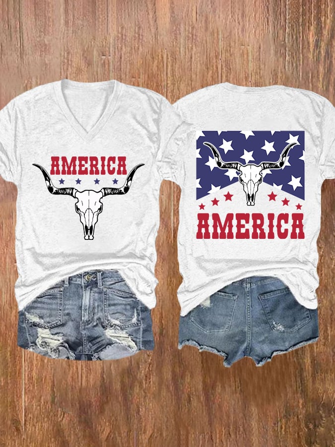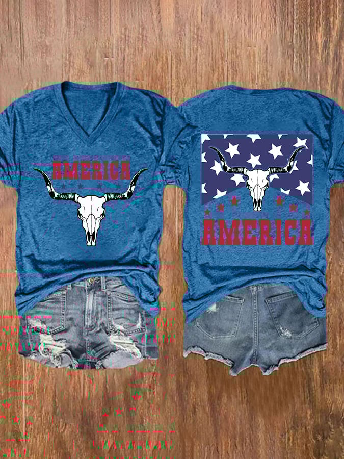 V-neck Retro America Independence Day Bull Skull Print T-Shirt