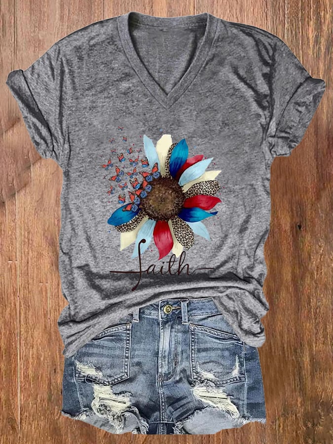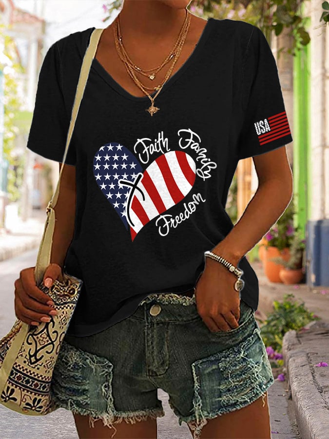 Women's America Flag Cross Faith Casual V-Neck Tee