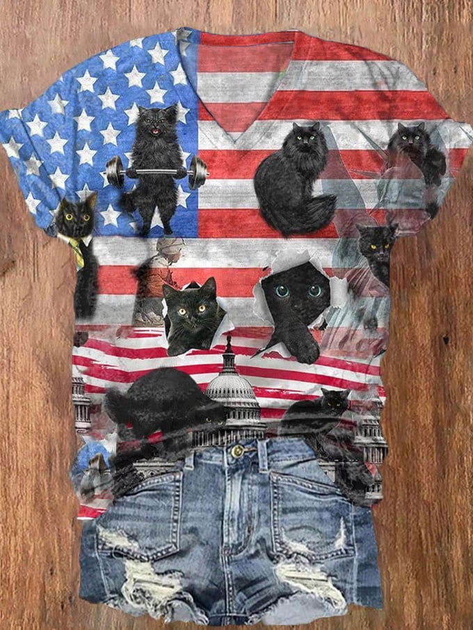 Women's Independence Day Resort Style Flag Black Cat Print V-neck T-shirt