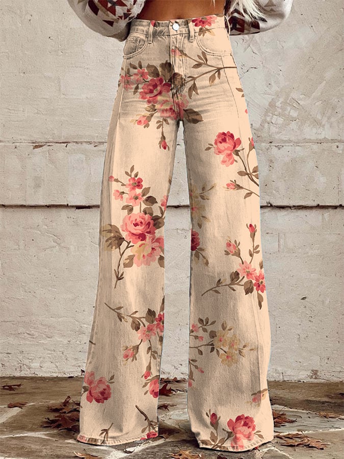 Women's Vintage Floral Print Wide Leg Pants