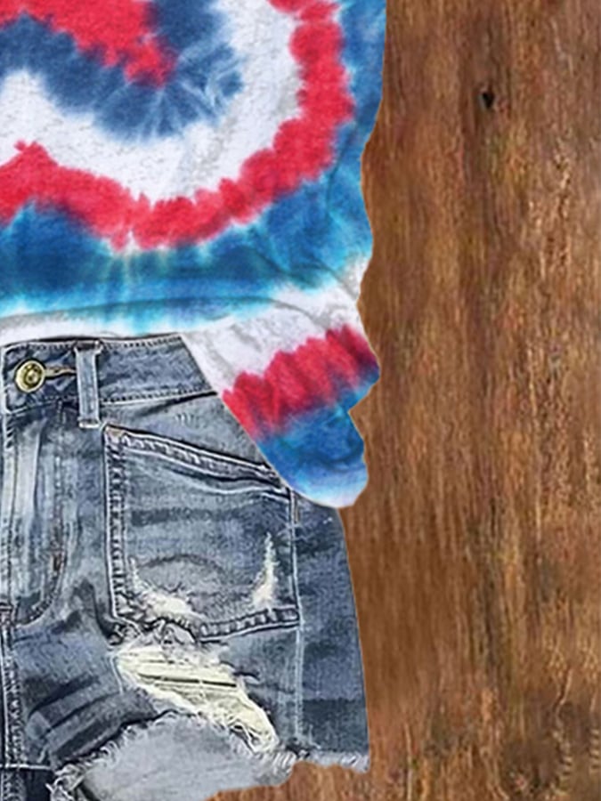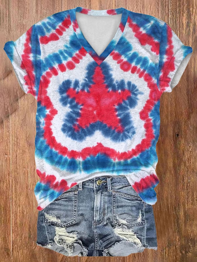 Women's Tie Dye Stars And Stripes Print V Neck T-shirt