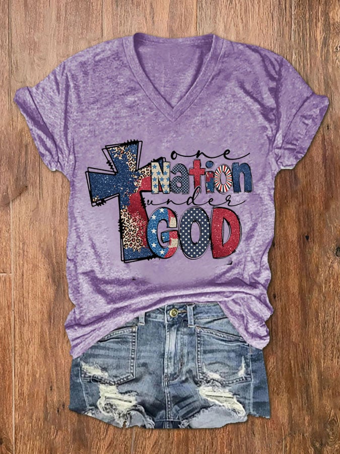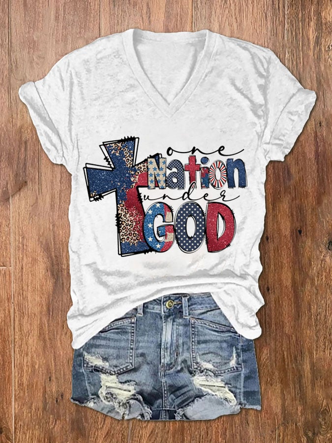 Women's Independence Day One Nation Under God Print V-Neck T-Shirt