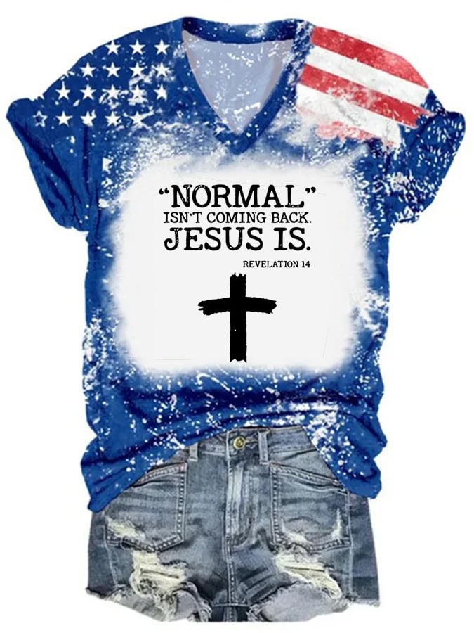 Women's Independence Day Jesus 2024 Make America Believe Again Printed V-neck T-shirt