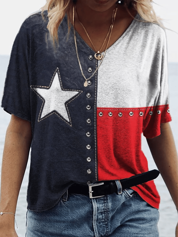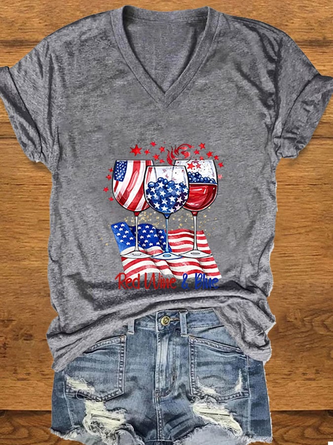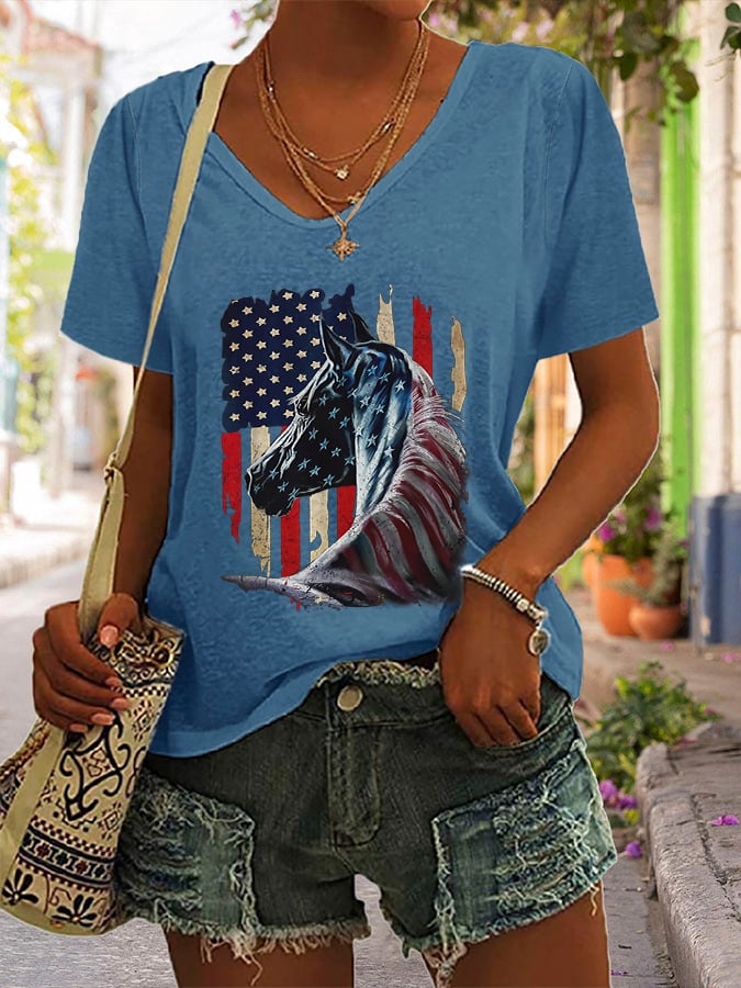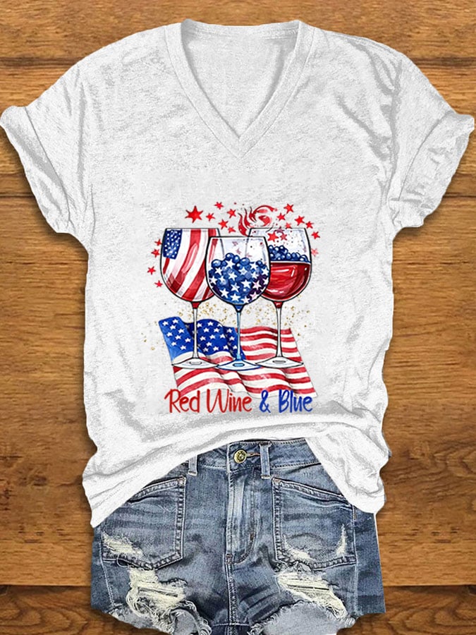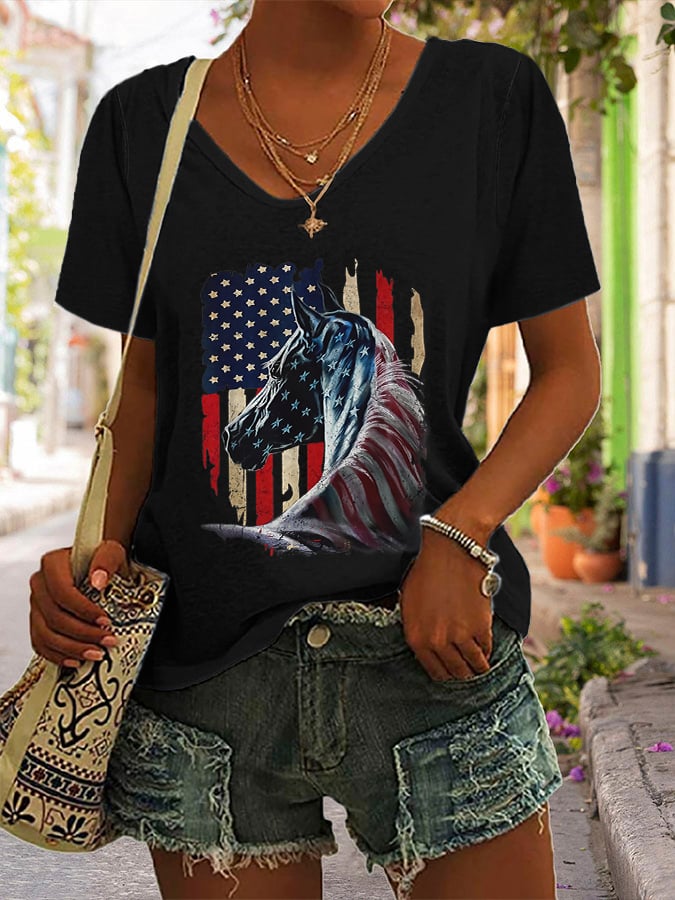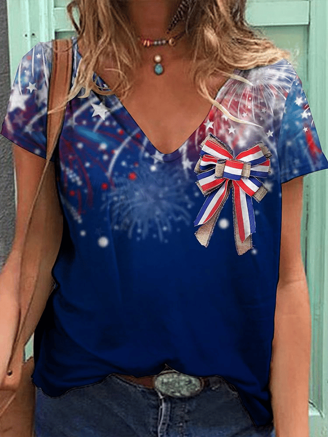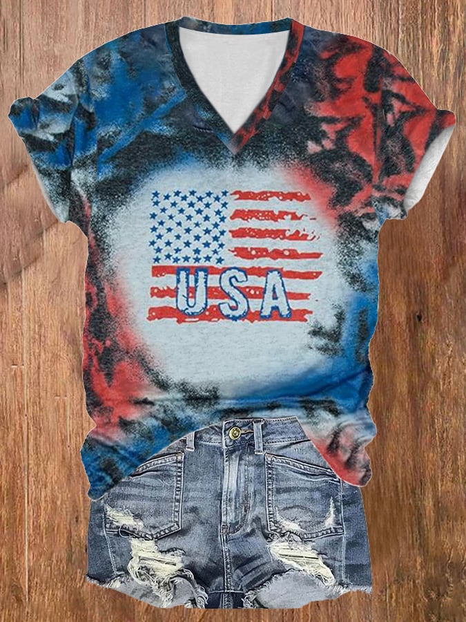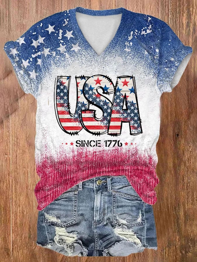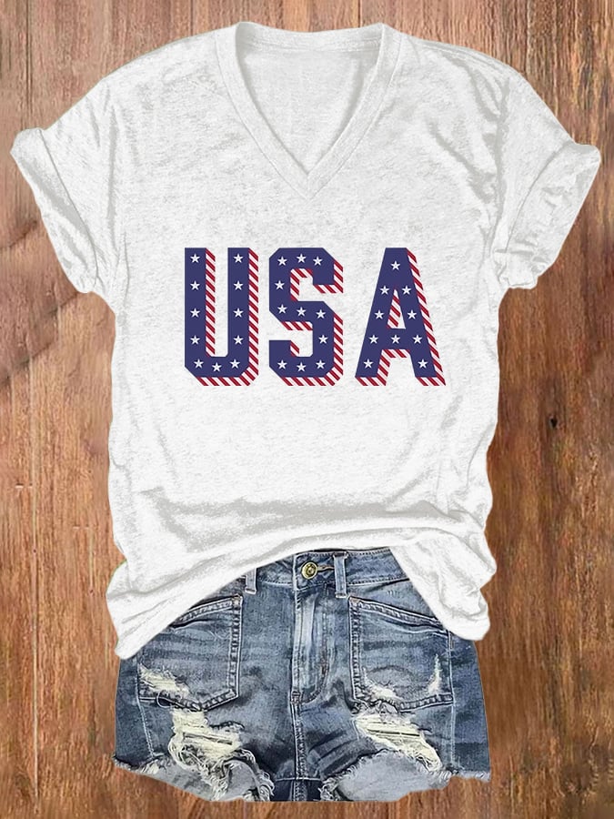 Women's American Flag Independence Day Print V-Neck T-Shirt