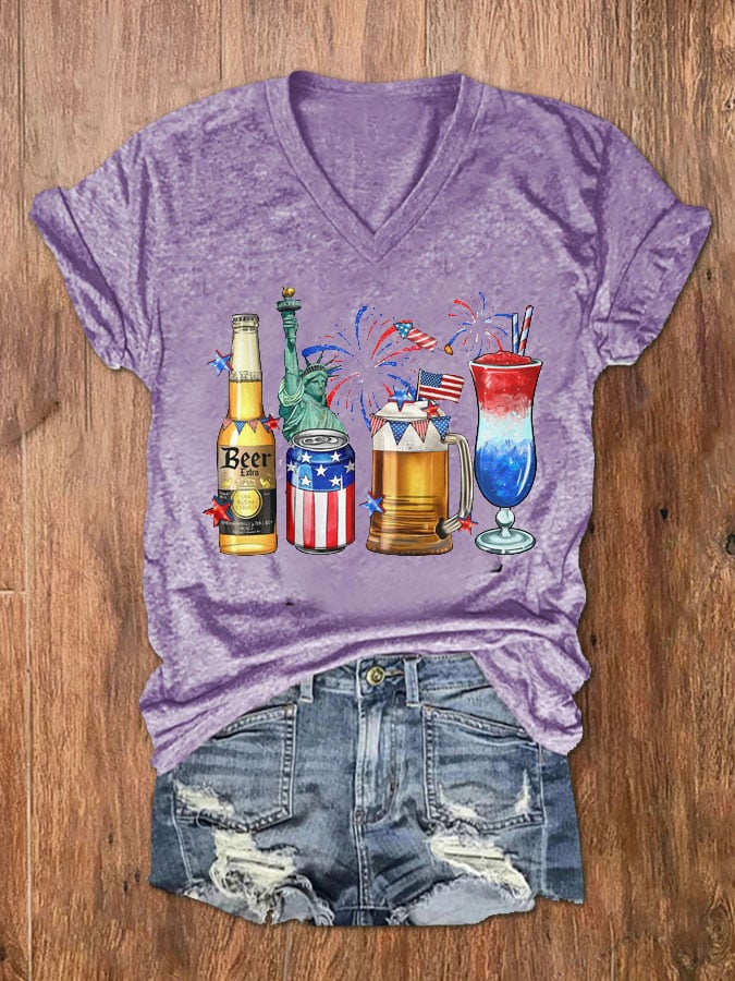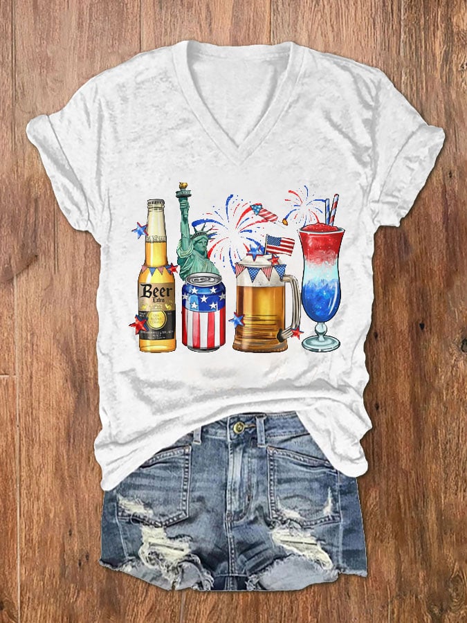 Women's 4th Of July American Drinks Print V-Neck T-Shirt