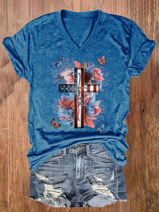 Women's Independence Day She Loves Jesus and America Too Printed V-neck T-shirt