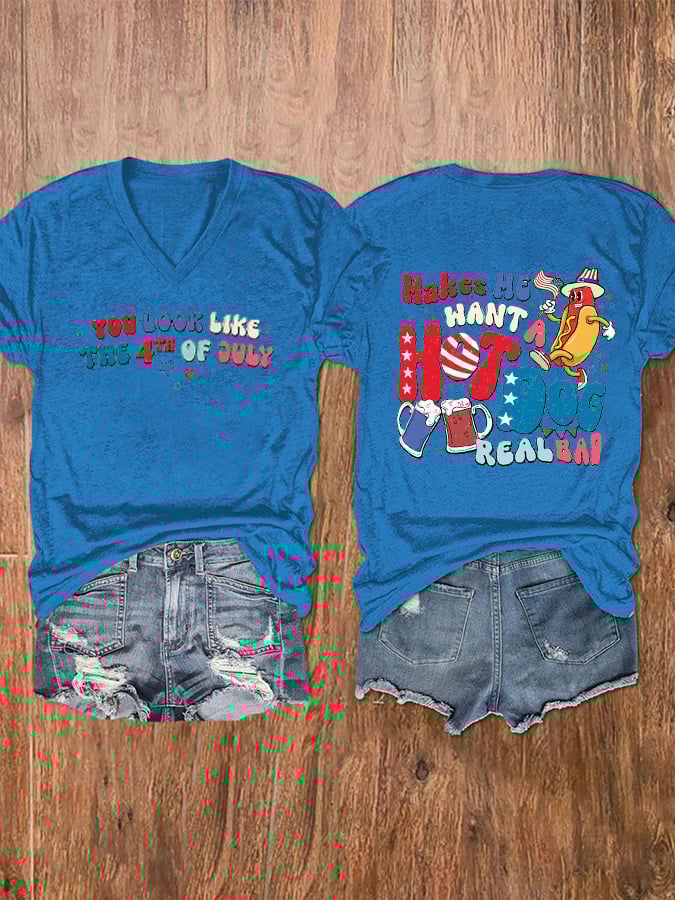 Women's Funny 4th July You Look Like The 4th Of July, Makes Me Want A Hot Dog Real Bad Print V-Neck T-Shirt