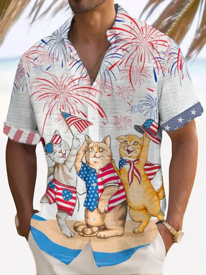 Men's Independence Day Resort Style Flag Funny Cat Print Shirt