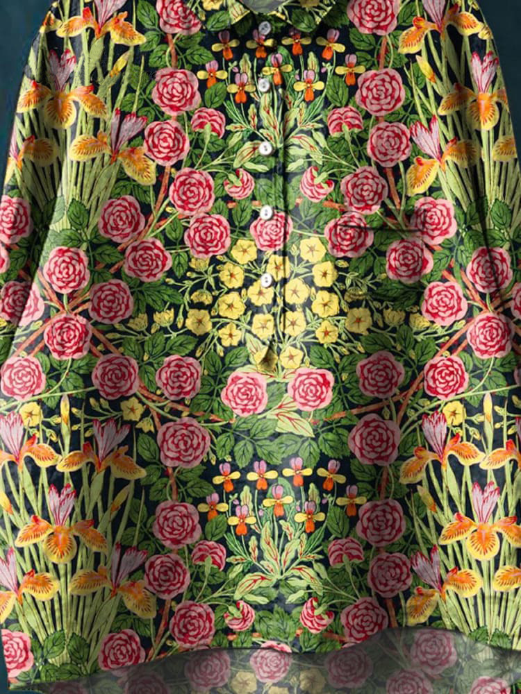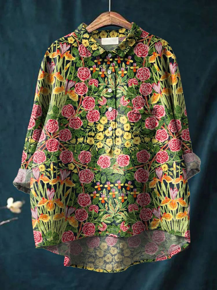 Colorful Spring Floral Garden Printed Women's Casual Cotton And Linen Shirt