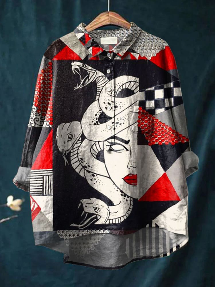 Vintage Medusa Geometric Pattern Art Print Casual Cotton And Linen Shirt