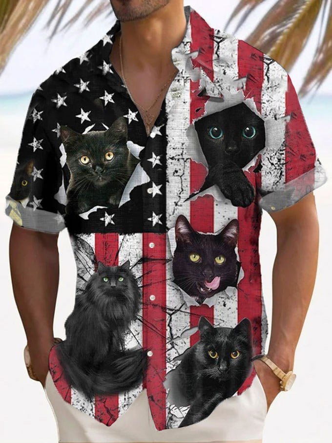 Men's Independence Day Resort Style Flag Black Cat Print Shirt
