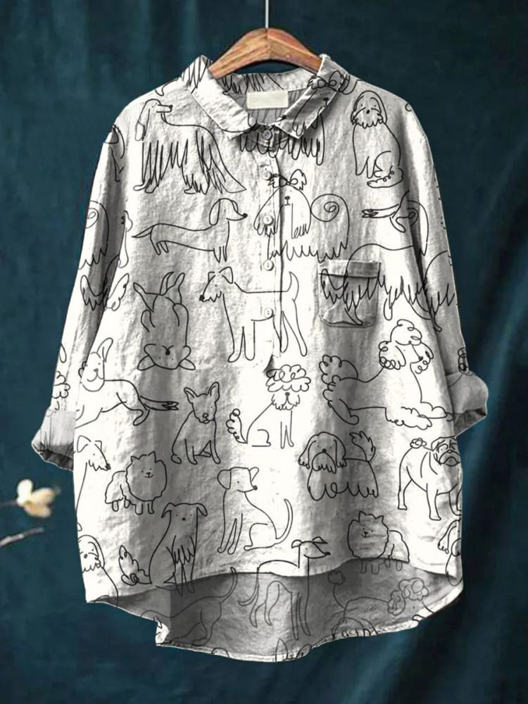 Women's Dog Art Print Casual Cotton And Linen Shirt