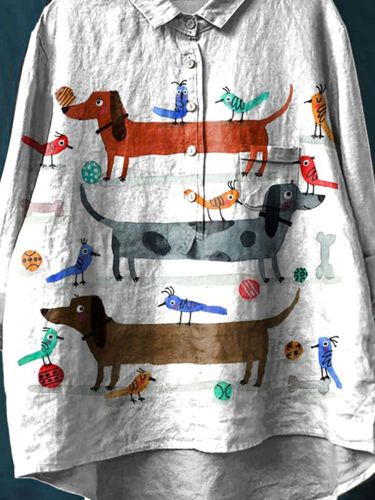 Women's Colorful Fun Cartoon Puppy Print Casual Cotton And Linen Shirt