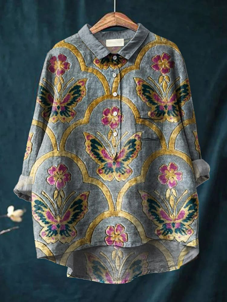Vintage Lovely Butterflies Art Print Casual Cotton And Linen Shirt
