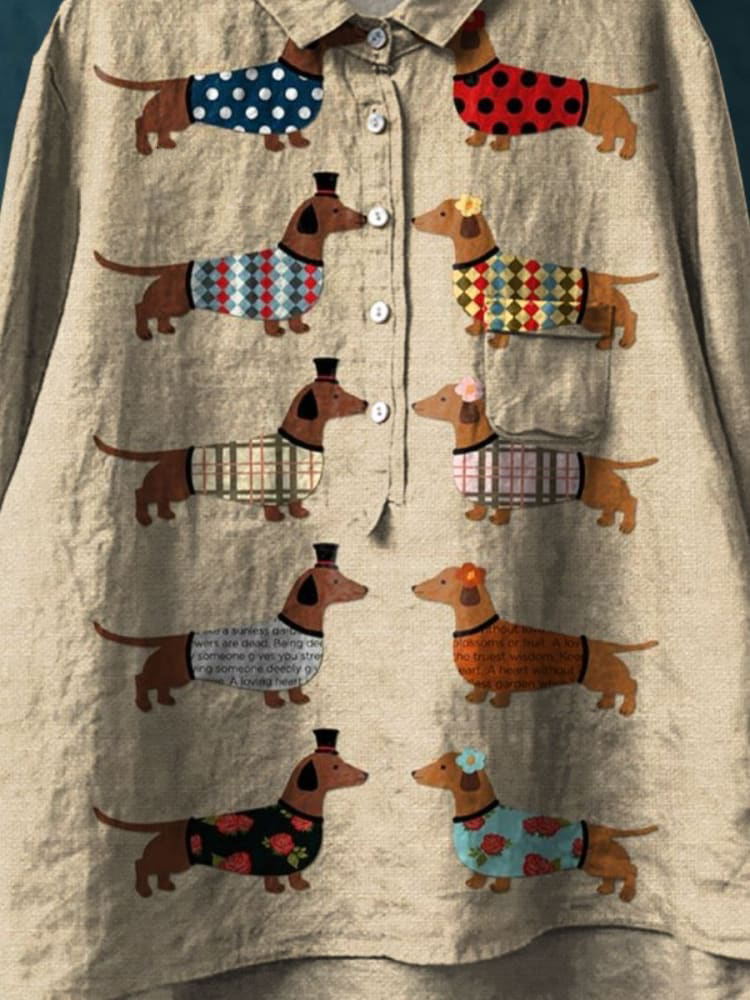 Vintage Lovely Dachshund Art Print Casual Cotton And Linen Shirt