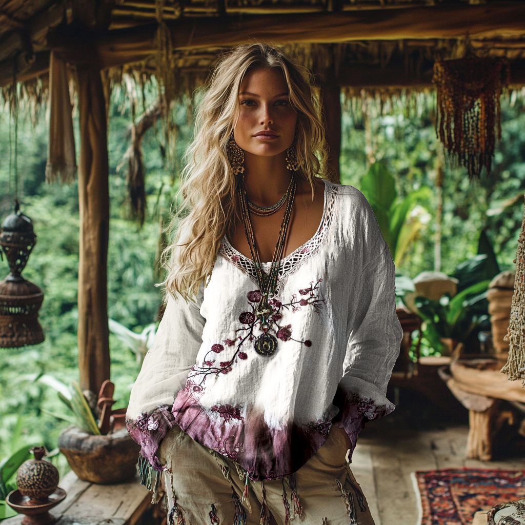 Women's Vintage Tribal Tassel Rose Embroidery Art Pattern Linen Shirt