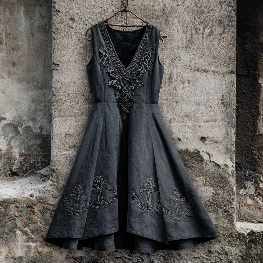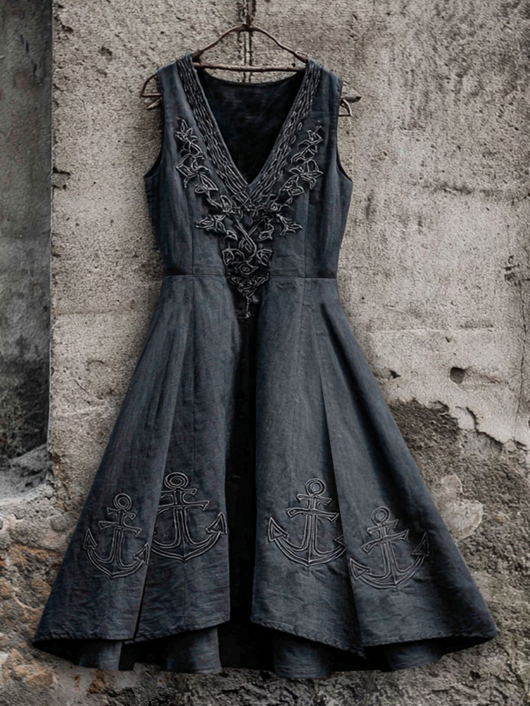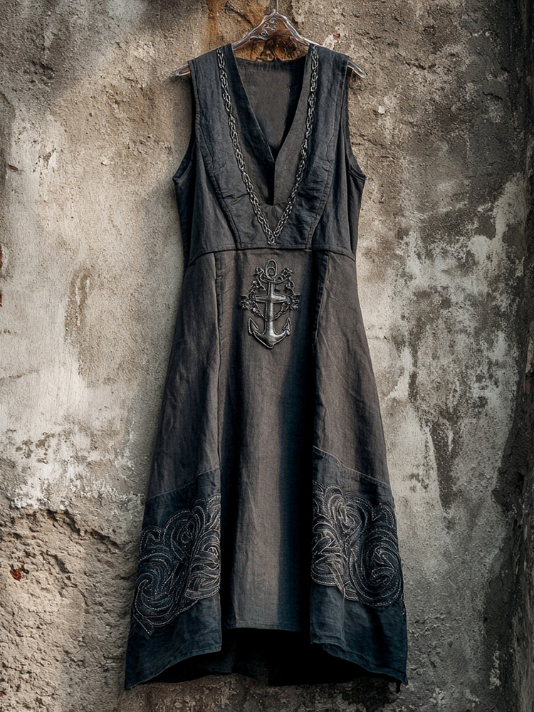 Vintage Anchor Skull Celtic Embroidered Art Linen Women's Pirate Midi Dress