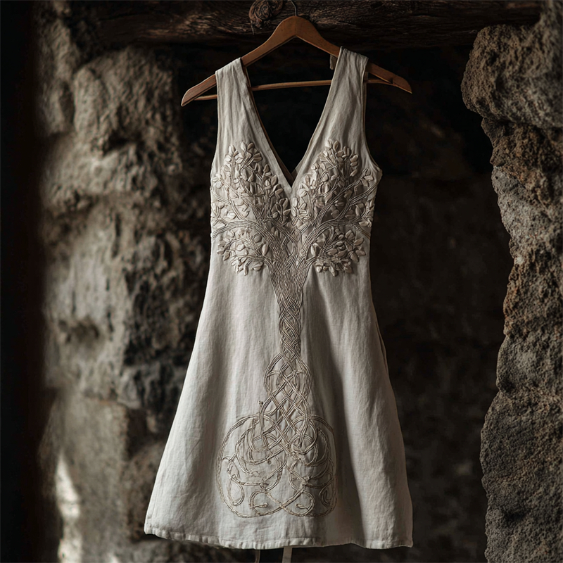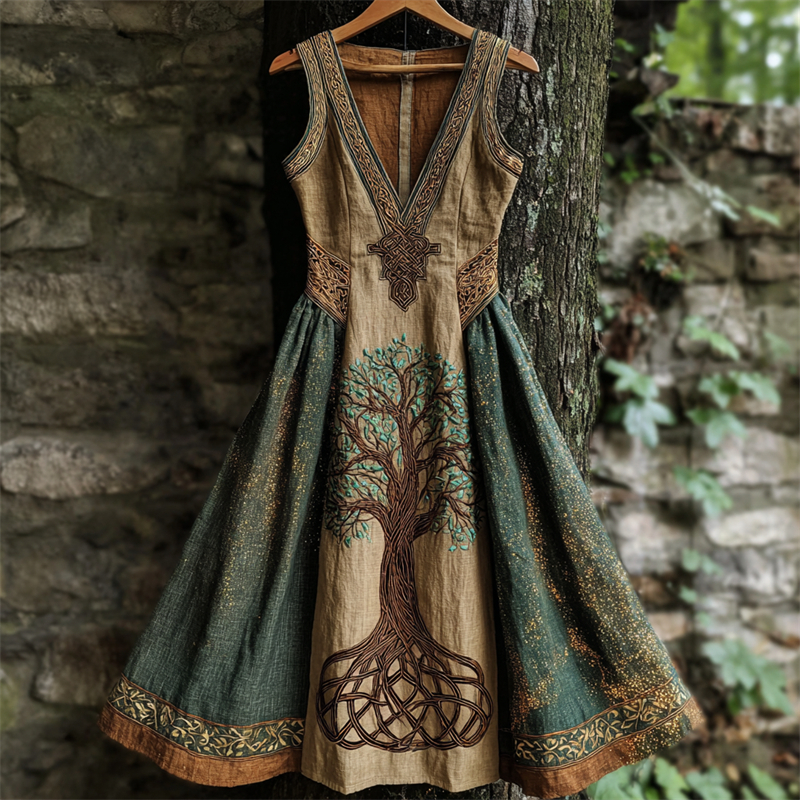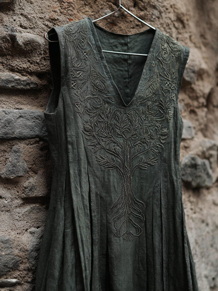 Vintage Tree Of Life Viking Glitter Sequins Contrast Linen Dress
