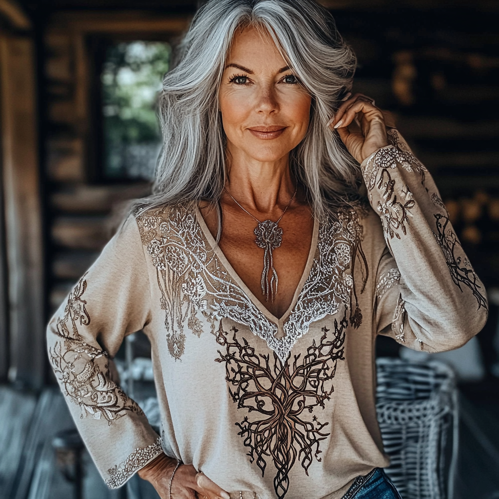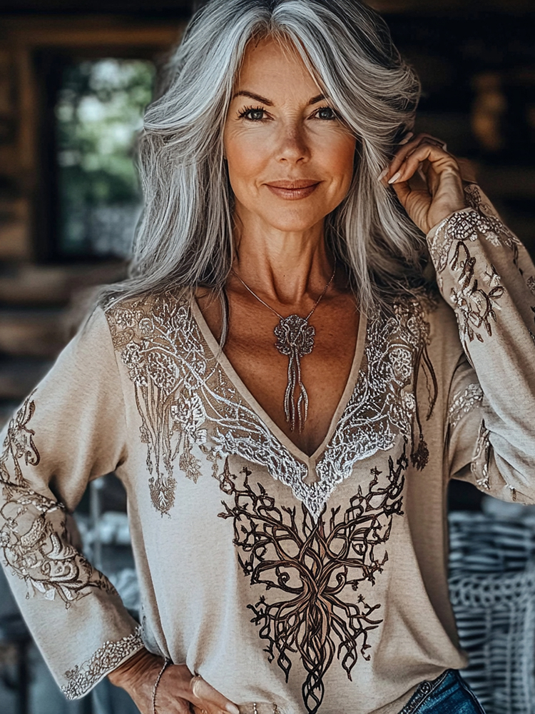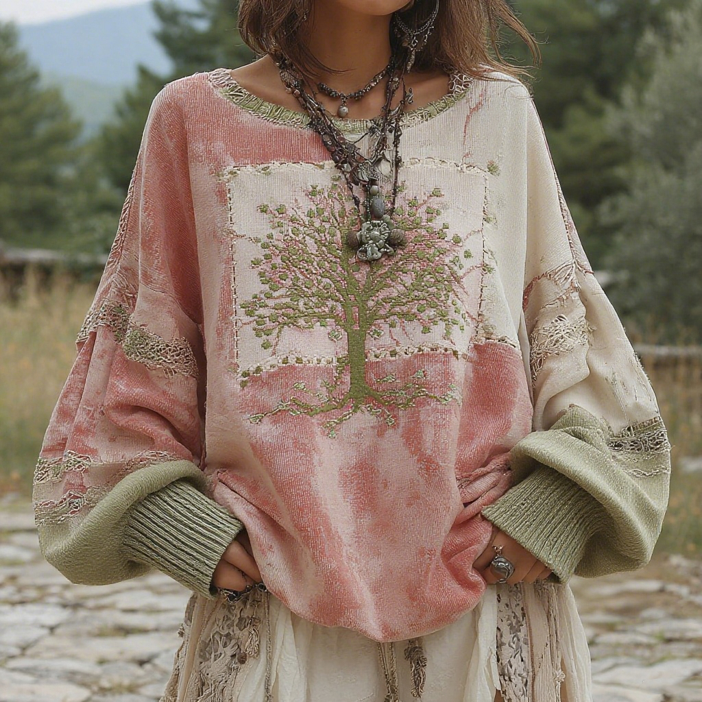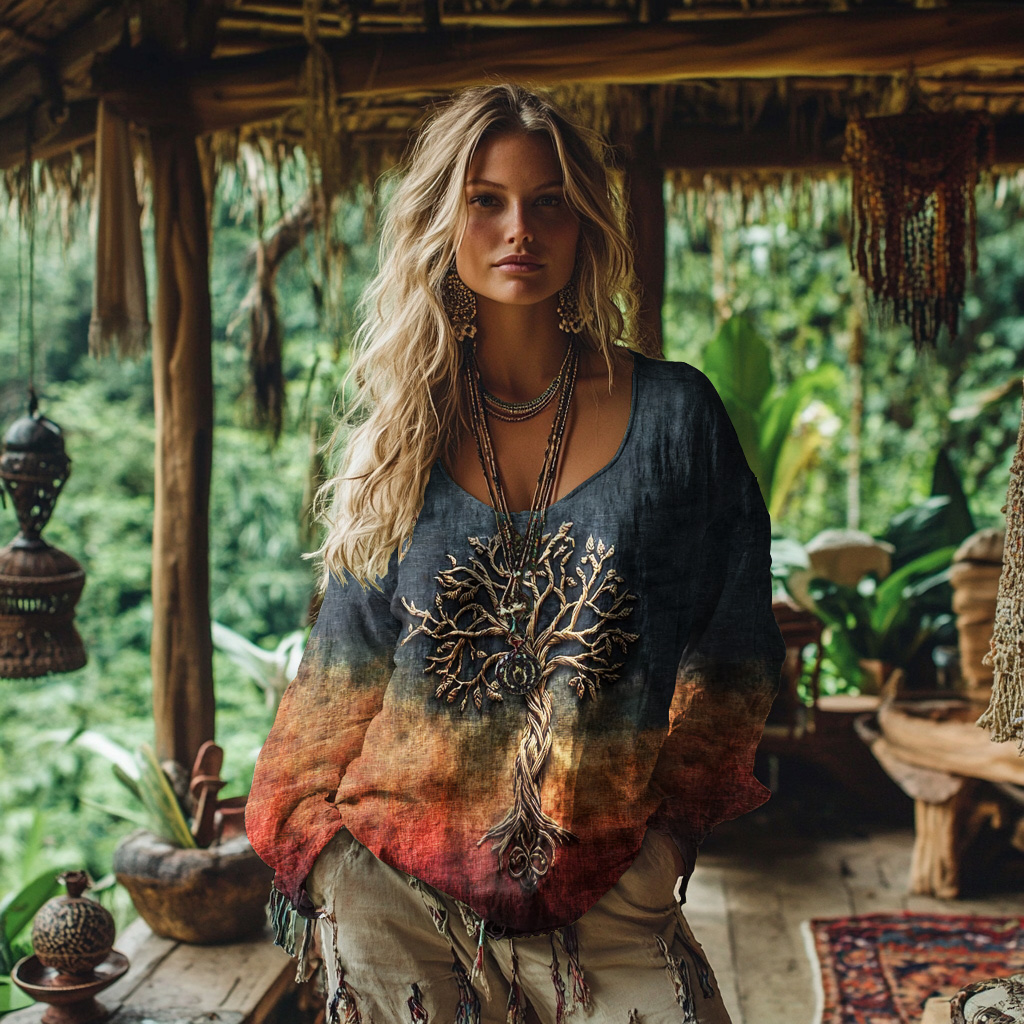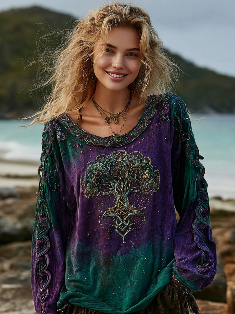 Women's Retro Viking Tree Of Life Stitching Warm V-neck Sweatshirt