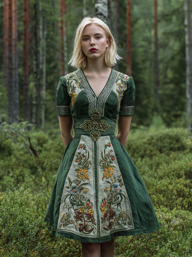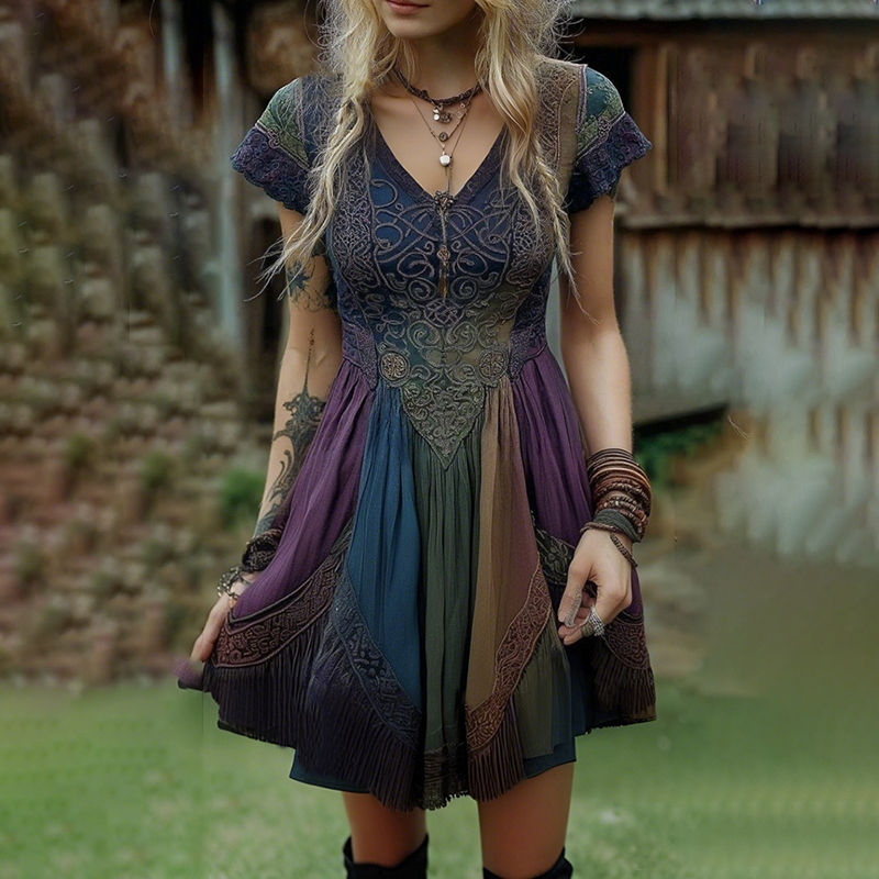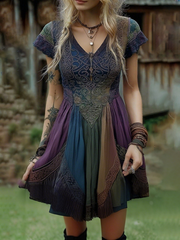 Women's Viking Celtic Floral Embroidery Patchwork Art Casual Short Mini Dress