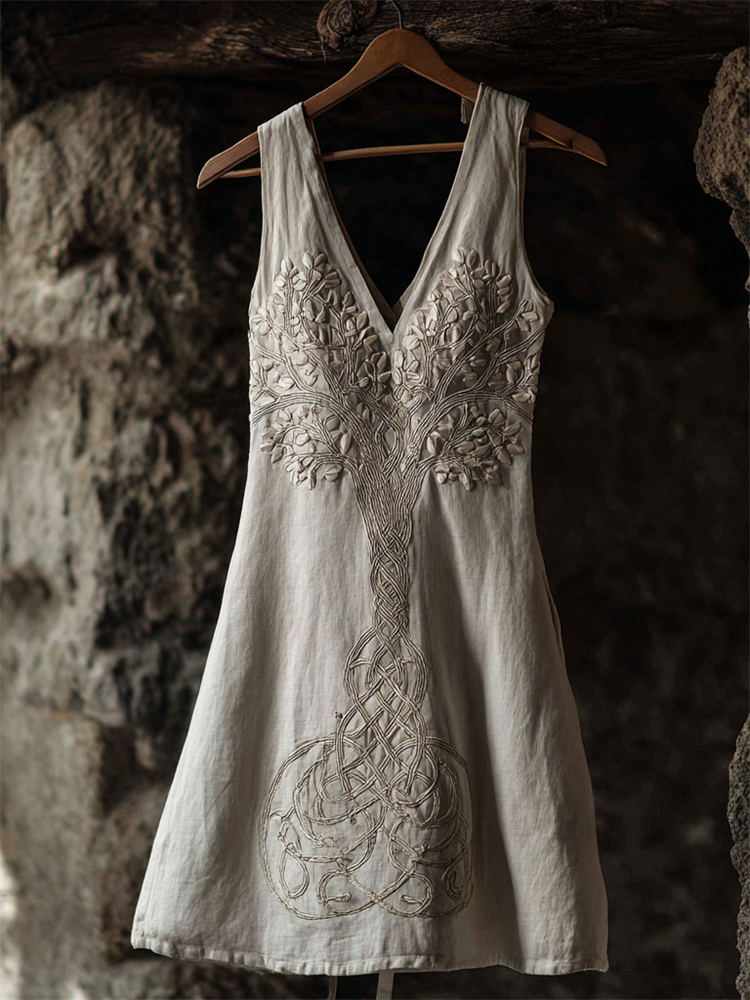 Vintage Viking Tree Of Life & Sequin Embroidery Women's Linen V-neck Mini Dress