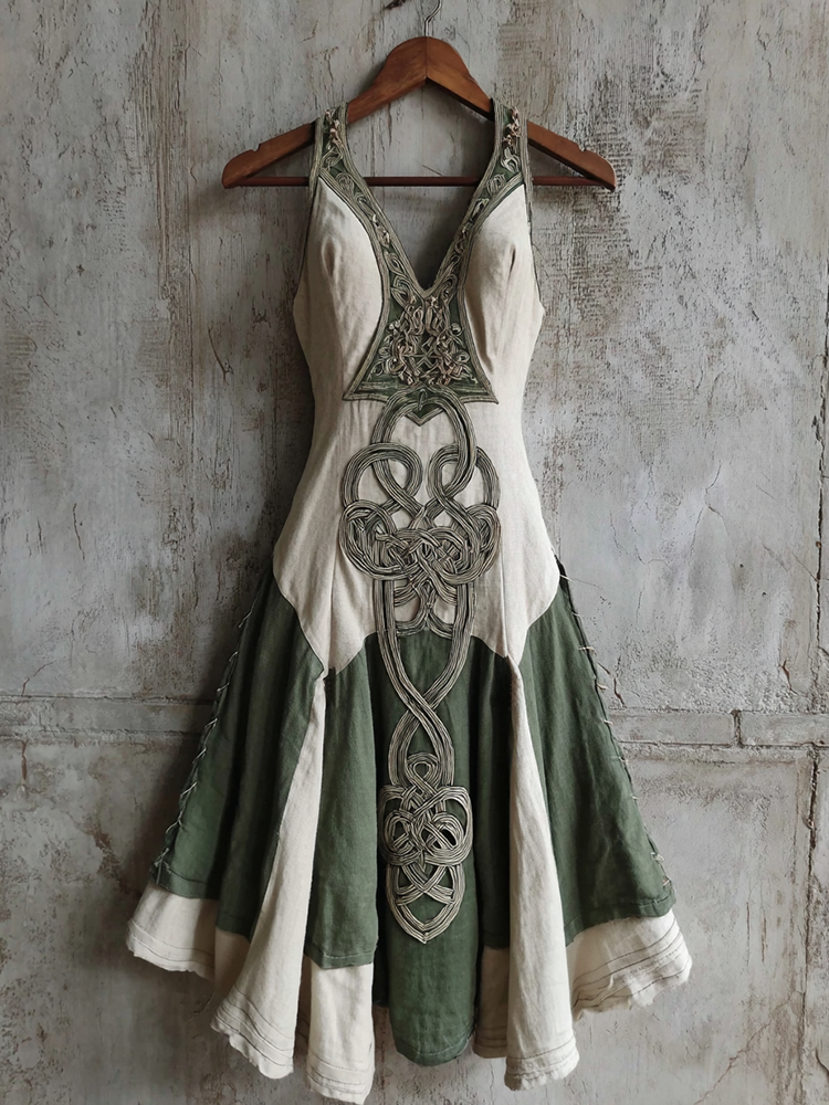 Vintage Celtic Knot Contrast Patchwork Midi Dress