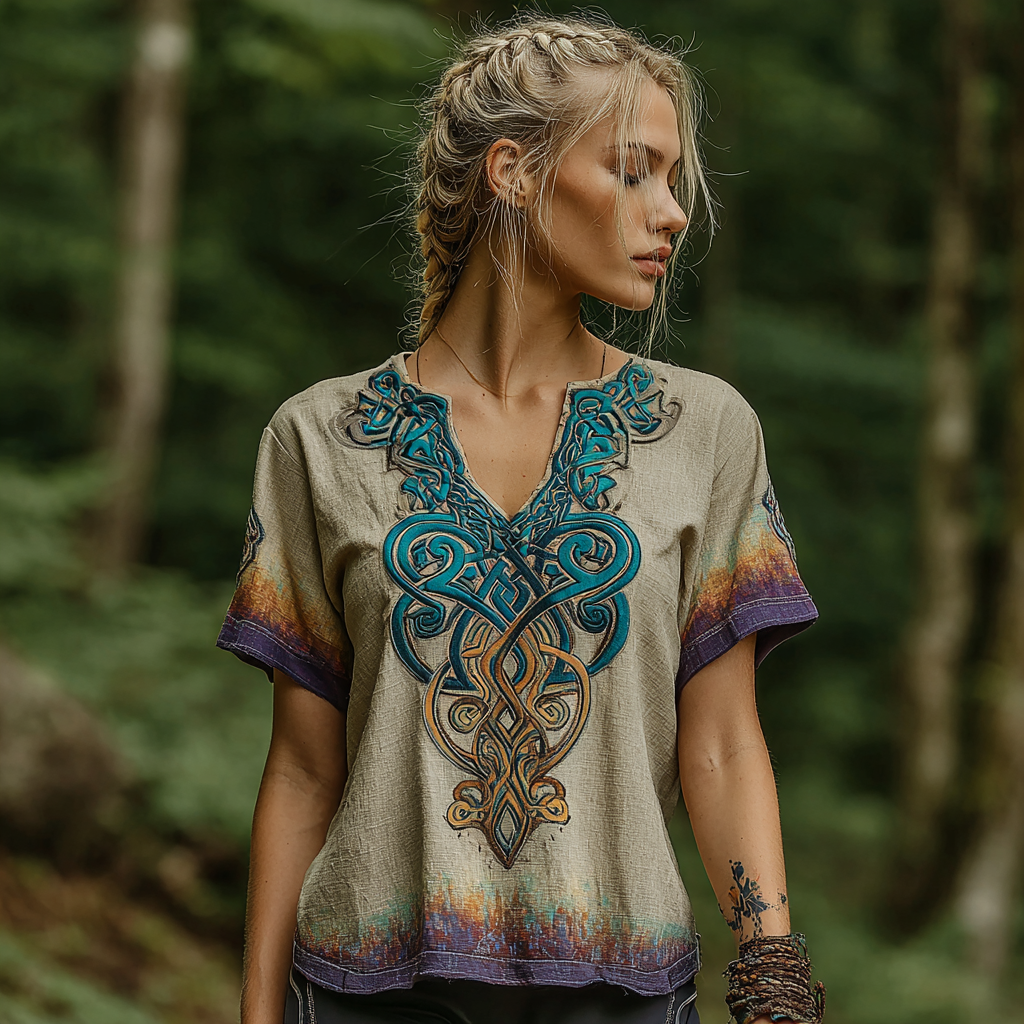 Women's Vintage Viking Celtic Knot Embroidery Gradient Art Shirt