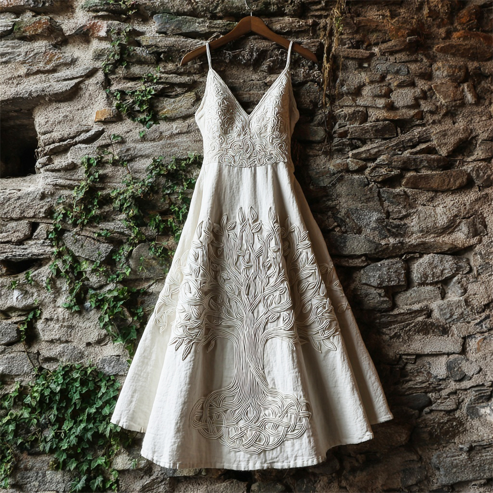 Nordic Myth Tree Of Life Embroidered Women's Linen V-neck Spaghetti Strap Maxi Dress
