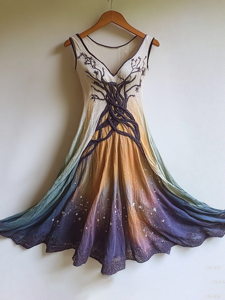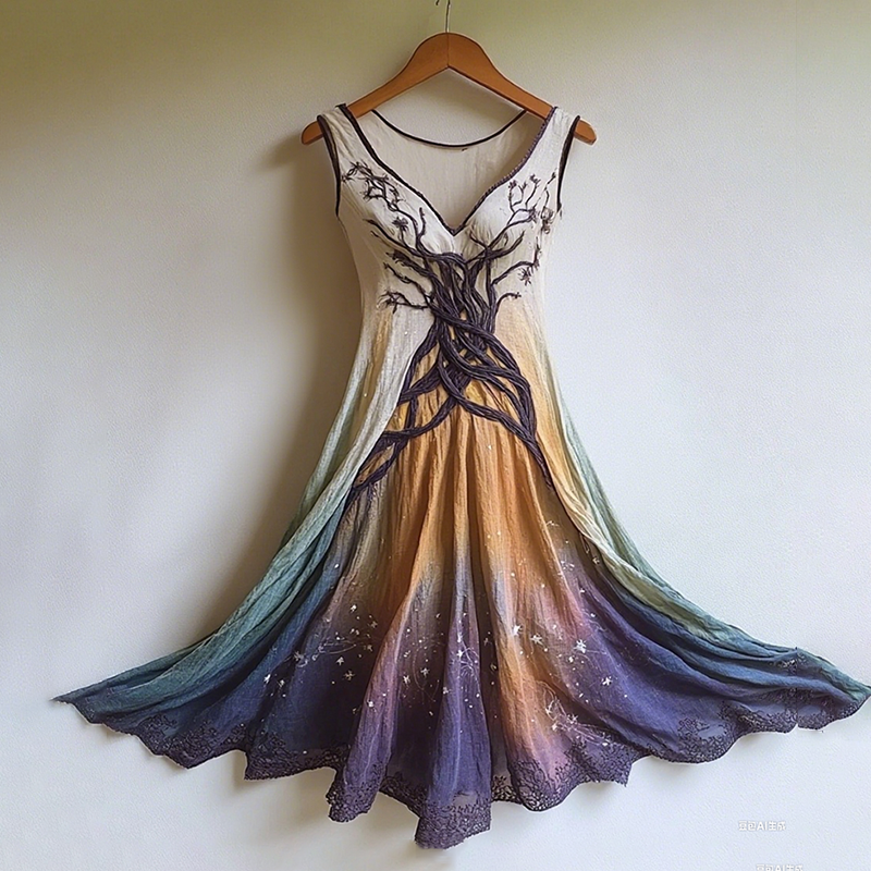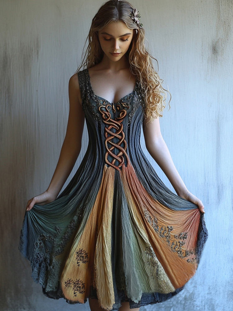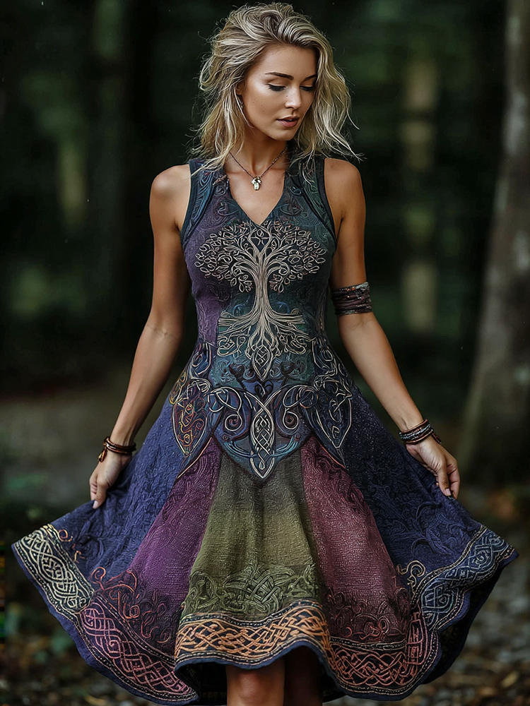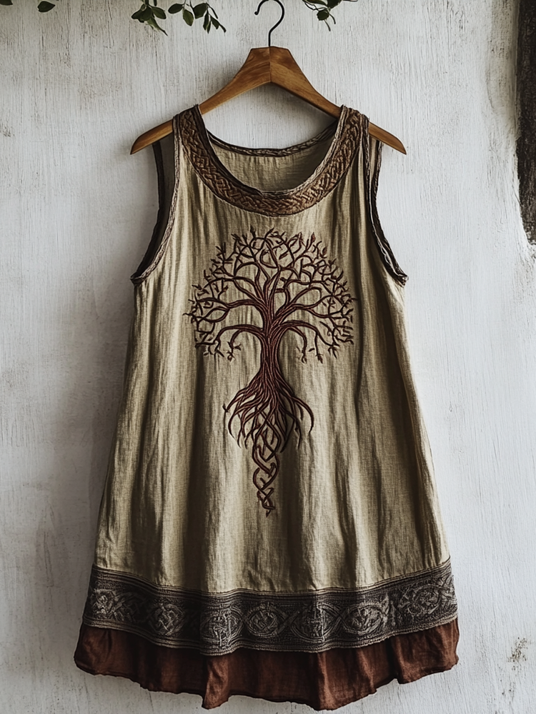 Women's Celtic Tree Of Life Patchwork Linen Midi Dress